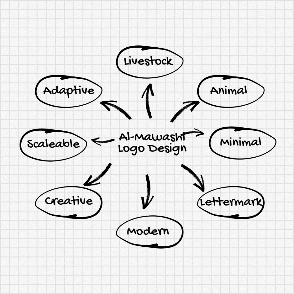 The first step in designing a logo for a livestock brand is brainstorming keywords and themes. For Al-Mawashi, key ideas included: