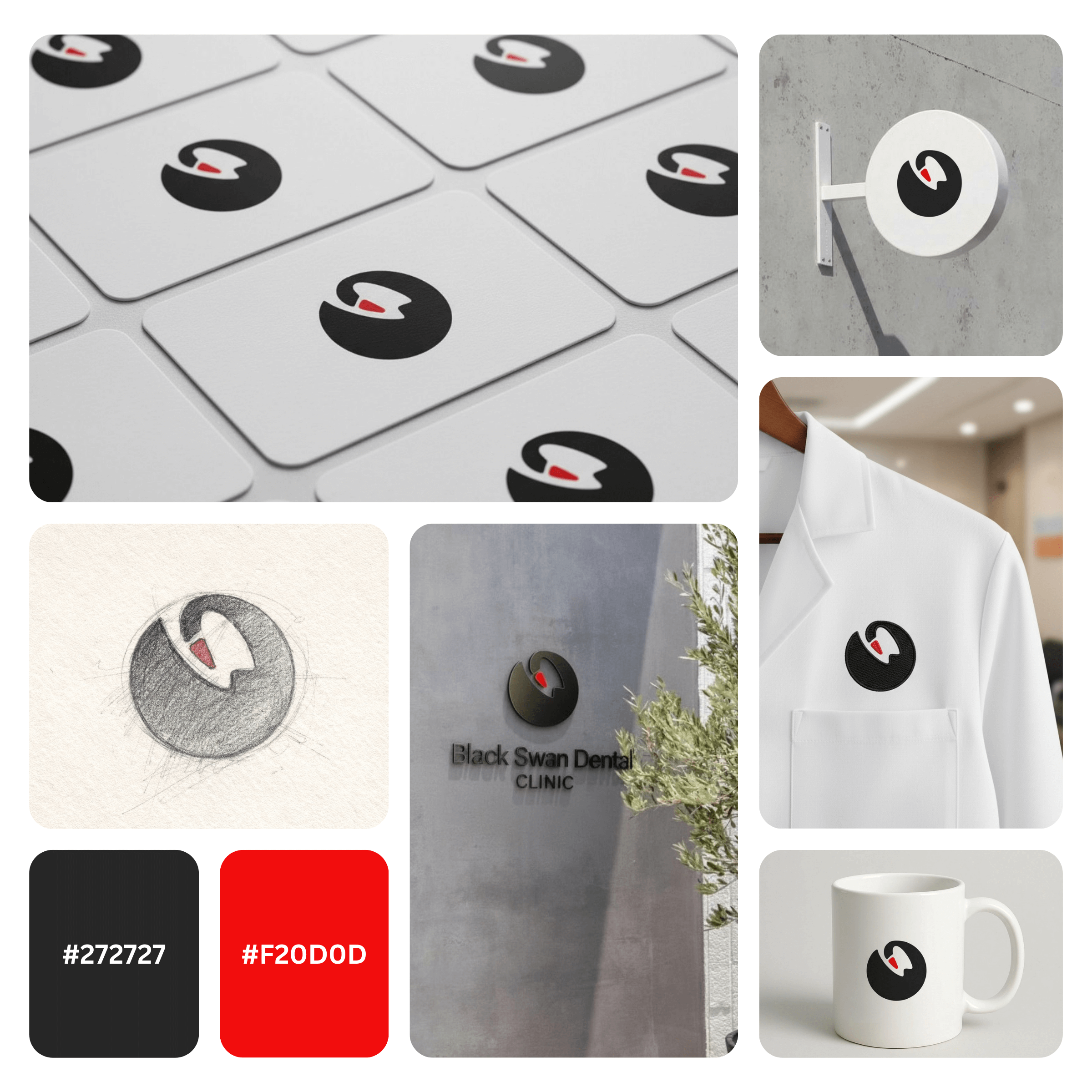 The Black Swan Dental Clinic Logo should be applied consistently across clinic signage, reception wall branding, appointment cards, prescription pads, staff uniforms, and patient welcome kits. Digitally, it performs best on website headers, Google Business Profile visuals, social media profile images, and paid ad creatives. Consistent usage builds trust through familiarity one of the strongest drivers of healthcare brand perception. A clean icon-first system also makes it easy to extend into patterns, icons, and wayfinding for a cohesive dental brand identity.